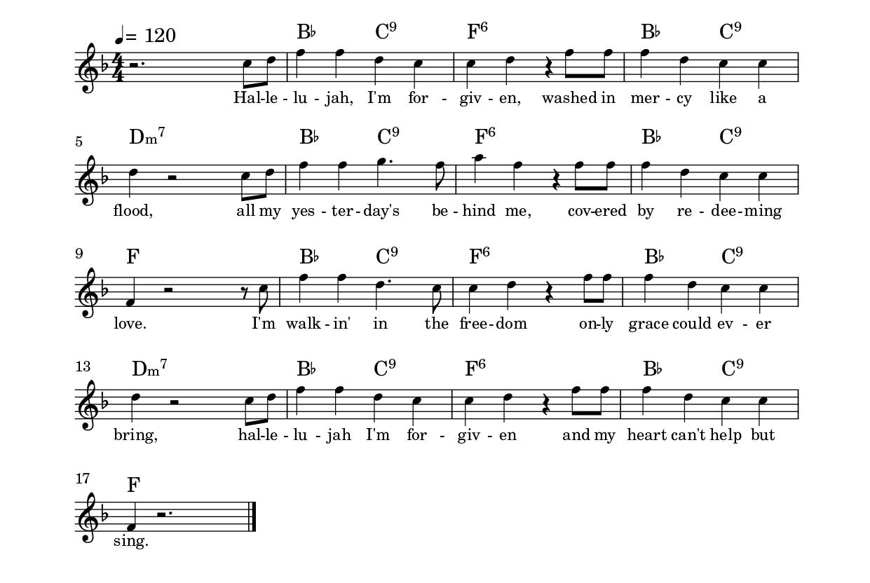 I was walkin’ down a long road, carryin’ all my shame, Till mercy found me tremblin’, and called me by my name. Now the weight is gone forever, like a stone rolled from my soul, And the joy of bein’ forgiven makes this broken heart whole. Now I wake up every mornin’ with a song inside my chest, ’Cause grace came like a sunrise and gave my weary heart its rest. I ain’t who I was yesterday, that old life’s said and done, And the joy of bein’ forgiven shines brighter than the sun. Hallelujah, I’m forgiven, washed in mercy like a flood, All my yesterday’s behind me, covered by redeeming love. I’m walkin’ in the freedom only grace could ever bring, Hallelujah, I’m forgiven – and my heart can’t help but sing. Friend, I’ve walked where you’re walkin’, felt the hurt you’re feelin’ now, Thought the road was too heavy, and I didn’t know how. But the same new light that found me can break through for you, There’s a sunrise waitin’ yonder, and it’s gonna find you too. Hallelujah, I’m forgiven, washed in mercy like a flood, All my yesterday’s behind me, covered by redeeming love. I’m walkin’ in the freedom only grace could ever bring, Hallelujah, I’m forgiven – and my heart can’t help but sing. Hallelujah, I’m forgiven, washed in mercy like a flood, All my yesterday’s behind me, covered by redeeming love. I’m walkin’ in the freedom only grace could ever bring, Hallelujah, I’m forgiven – and my heart can’t help but sing.